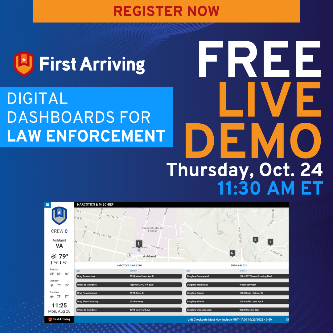 In this live session, you'll see a quick demo of the First Arriving dashboard/digital signage product, along with how to get started, request a demo, and Q&A with product experts who can show you how to improve Law Enforcement Agency communications. Register Now >