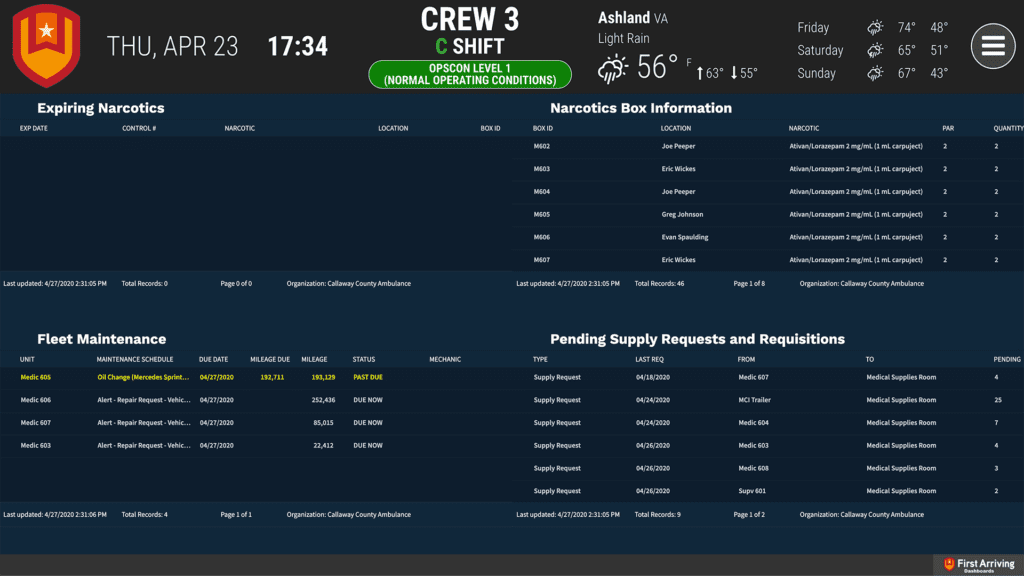 Suite of Dashboard Integrations Provides Agency Personnel with Critical Updates on Apparatus Inspections, Narcotics Information, Supply Requests, Fleet Maintenance and Service Tickets