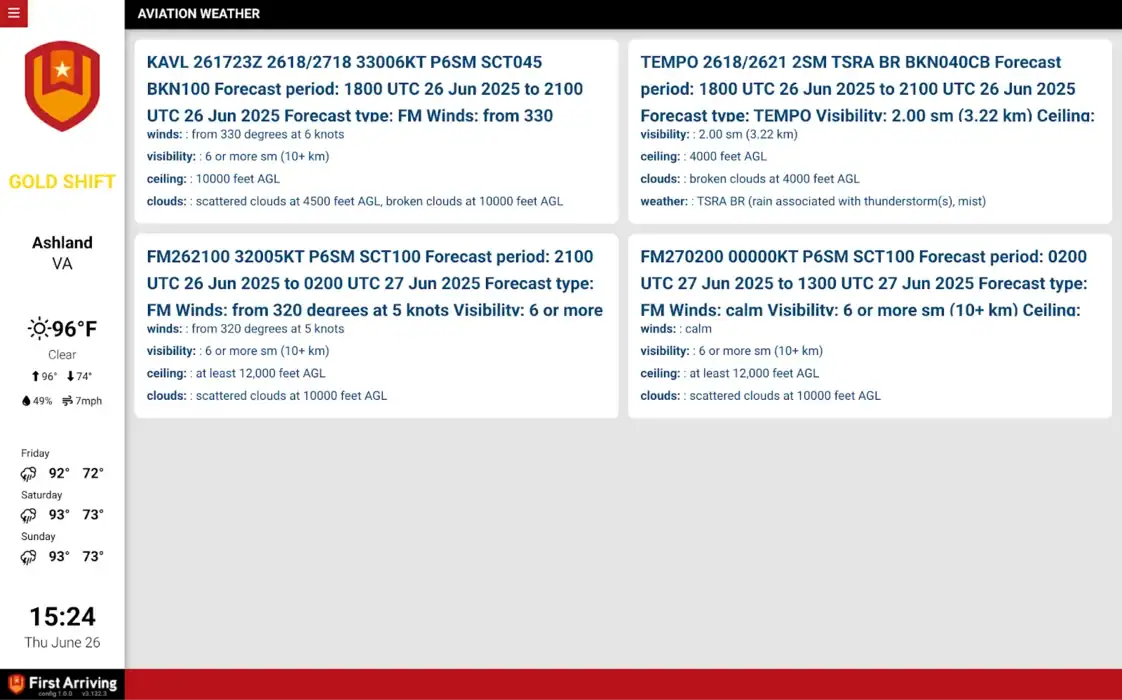 First Arriving dashboards can show data from NOAA, specifically for aviation weather for our customers that have airports in their area. This information includes more weather information that exceeds our already included weather integration.