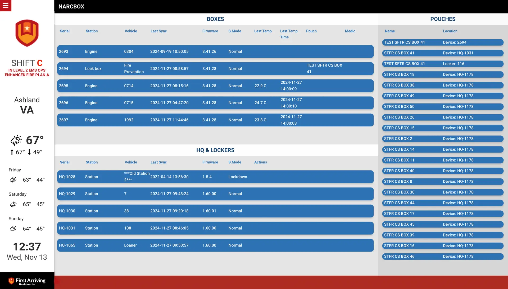 First Arriving’s integration with Narcbox by EMS Logik allows real-time reporting of your out-of-pharmacy narcotics stored in NarcBox devices to be shown directly on your dashboards. This allows customers to, at a glance, see status of different boxes and lockers, even pouches, all the way down to serial numbers and location, the last sync, and also the last reported temp! Ensuring everything is on track will be much easier allowing this information to be front and center on your dashboards.