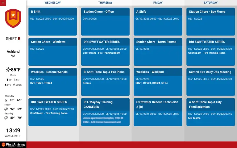 The Google Calendar Integration connects Google calendars with First Arriving Dashboards. It displays event data in an easy-to-read calendar or feed format. It’s great for sharing shift schedules, meetings, public events, or leadership availability.