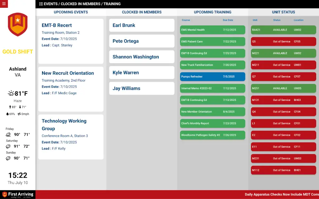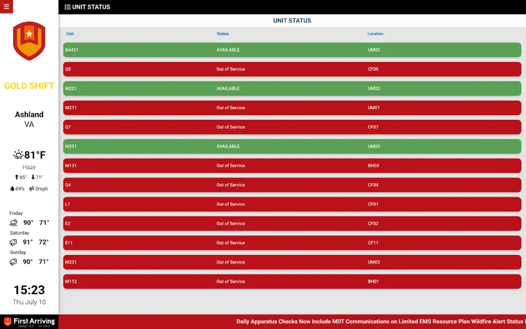 First Arriving’s Integration With Locution Systems Expands Your Station Alerting By Displaying Dispatch Information To All Of Your Connected Dashboards In Real-Time! In Addition To Showing Your Calls, You Can Also Show All Unit Status For Units Within Your Department And Even Neighboring Departments.