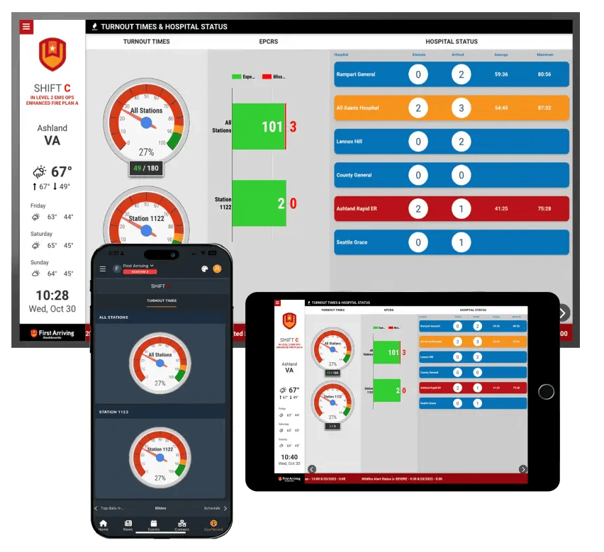 The First Arriving Information Platform unifies the systems your organization depends on — CAD, RMS, staffing, fleet, facilities, GIS, scheduling, training, alerts, and more. Instead of bouncing between apps or searching inboxes, your teams get a real-time operational picture tailored to their role, location, and device.