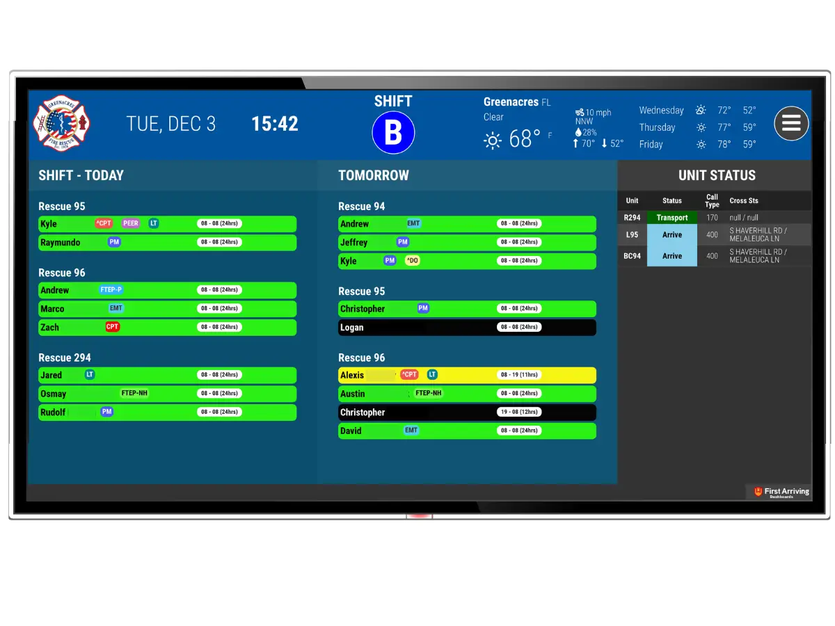 Greenacres Fire Rescue in Florida has harnessed First Arriving’s dashboard technology to improve communication not only within their own department, but also with their city leadership. By installing a dashboard in their city manager’s office, the fire department has made everything it does visible in real time – from emergency calls, to training, to staff announcements, and more – creating an impact that a traditional report just can’t beat.
