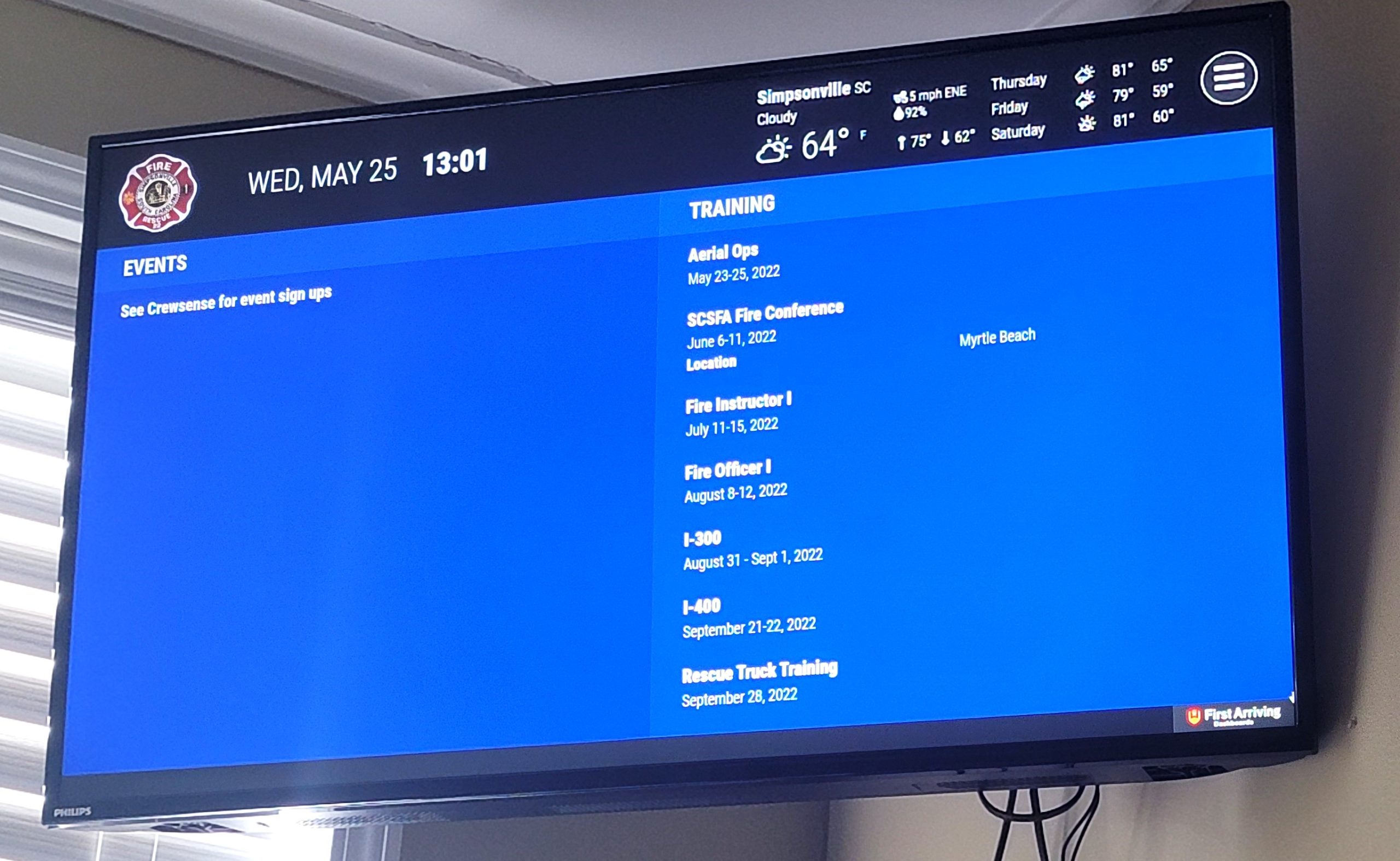 “The dashboards are a much better way of sending out information and announcements, especially training information, especially due to COVID,” said Gulledge. The fire department has one dashboard in service in all six firehouses and the administration building. The integrations the fire department has are weather, Emergency Reporting, Google Sheets, and Google Slides. “Working with First Arriving has been good. Even though it is technical, it is so easy to update that one person does it,” said Gulledge. He added that they plan to add more integrations and update the timing of the slides to get more out of their digital dashboard platform.