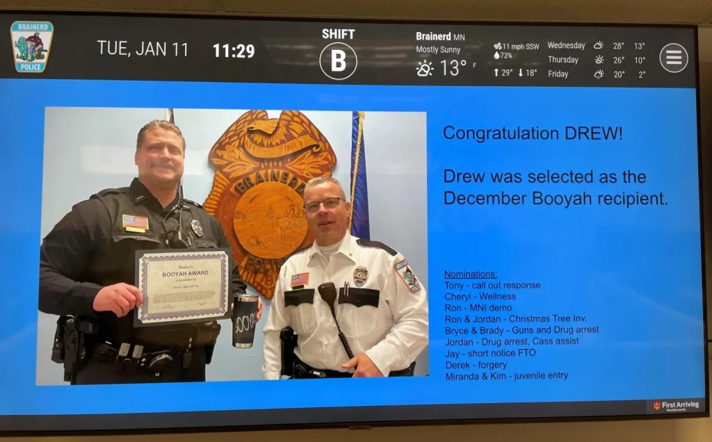 The digital dashboard platform of the Brainerd (MN) Police Department includes integrations for email, Google Sheets, Google Slides, Outlook, traffic cameras, Facebook, Twitter, and the department website. Their main goal is to make the incoming shift aware of vital information—as well as more connected.