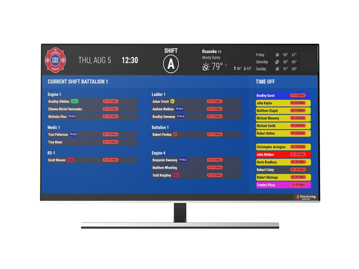 This basic level of information sharing has now been enhanced with the use of digital dashboards in each fire station. Chief Hoback says that they first saw the digital dashboards from First Arriving at the Virginia Fire Rescue Conference and were interested in the many features available as well as means to distribute essential information.